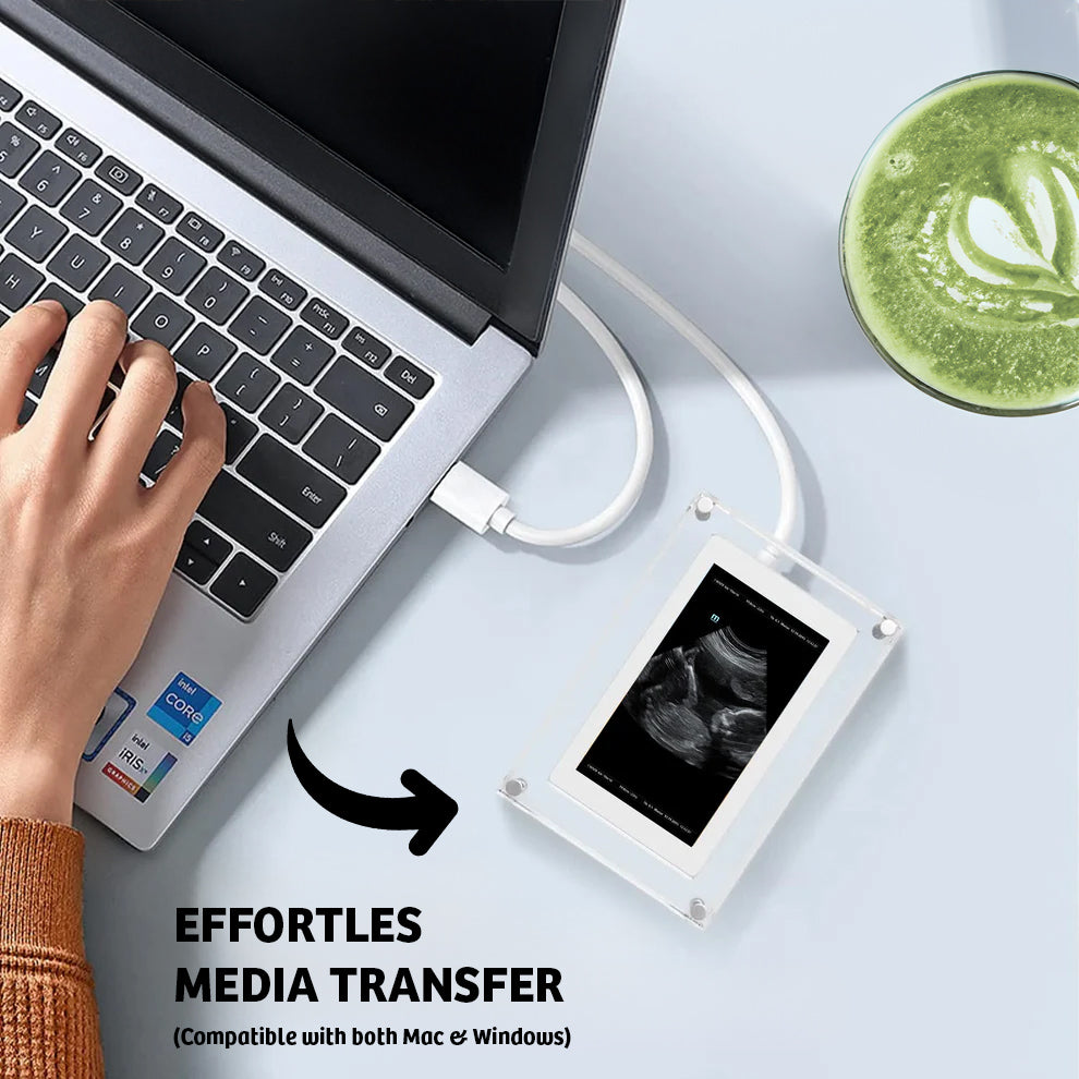 Simply connect the frame to your computer using the included USB cable. Drag and drop your ultrasound photos or videos into the folder — done!